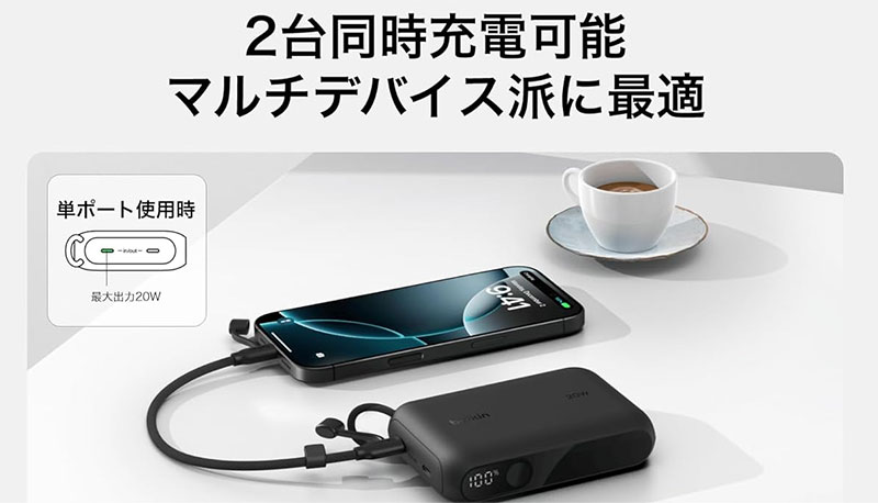 | Belkin BoostCharge 10000mAh | 10,000mAh | 20W | あり | ★★★★☆ | ★★★★☆ |