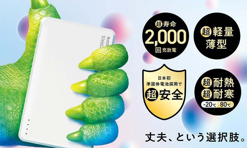 このJOVYが今回の5製品で一番注目してほしいモデルです。 従来のリチウムイオン電池ではなく「準固体電池」を使っていて、電解液が半固体なので液漏れや発火のリスクが大幅に低いんです。
